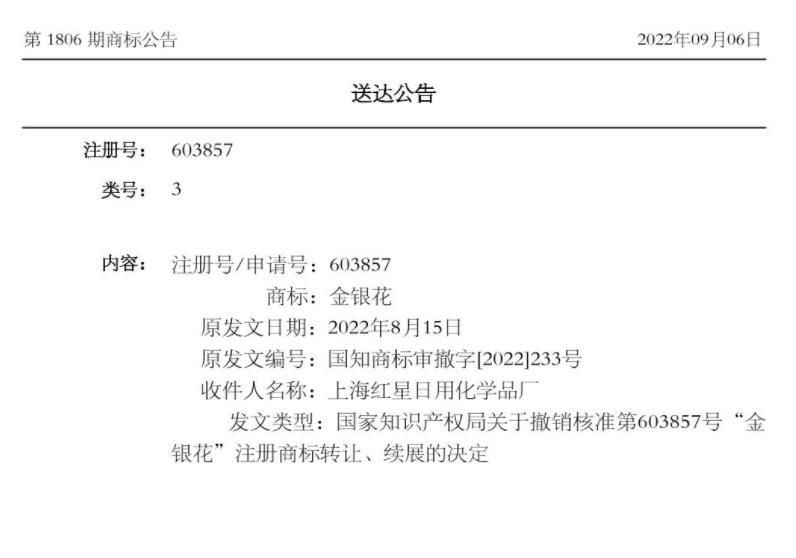 中新网9月8日电 国家知识产权局官网6日发布的第1806期商标公告公布了一份送达公告,显示国家知识产权局已于2022年8月15日向上海红星日用化学品厂发出函件,内文为国家知识产权局关于撤销核准第号“金银花”注册商标转让、续展的决定。